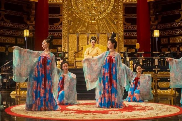 中秋夜游天堂名堂,大殿載歌載舞,仿佛回到千年前大唐盛世。中秋之日,一群盛裝歌姬白天登闕樓一睹恢弘盛世,傍晚在河邊放逐水燈許愿、思念家鄉(xiāng),夜晚在華麗的舞臺(tái)歌舞升平。一派大國(guó)盛世、國(guó)泰民安的場(chǎng)景。