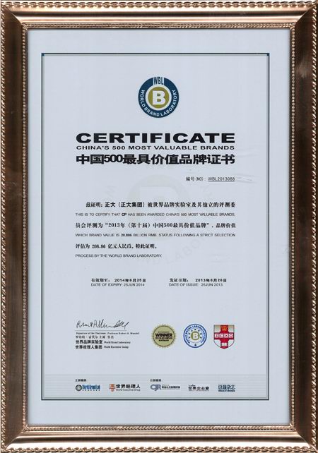 正大集團(tuán)榮膺“中國(guó)500***具價(jià)值品牌”